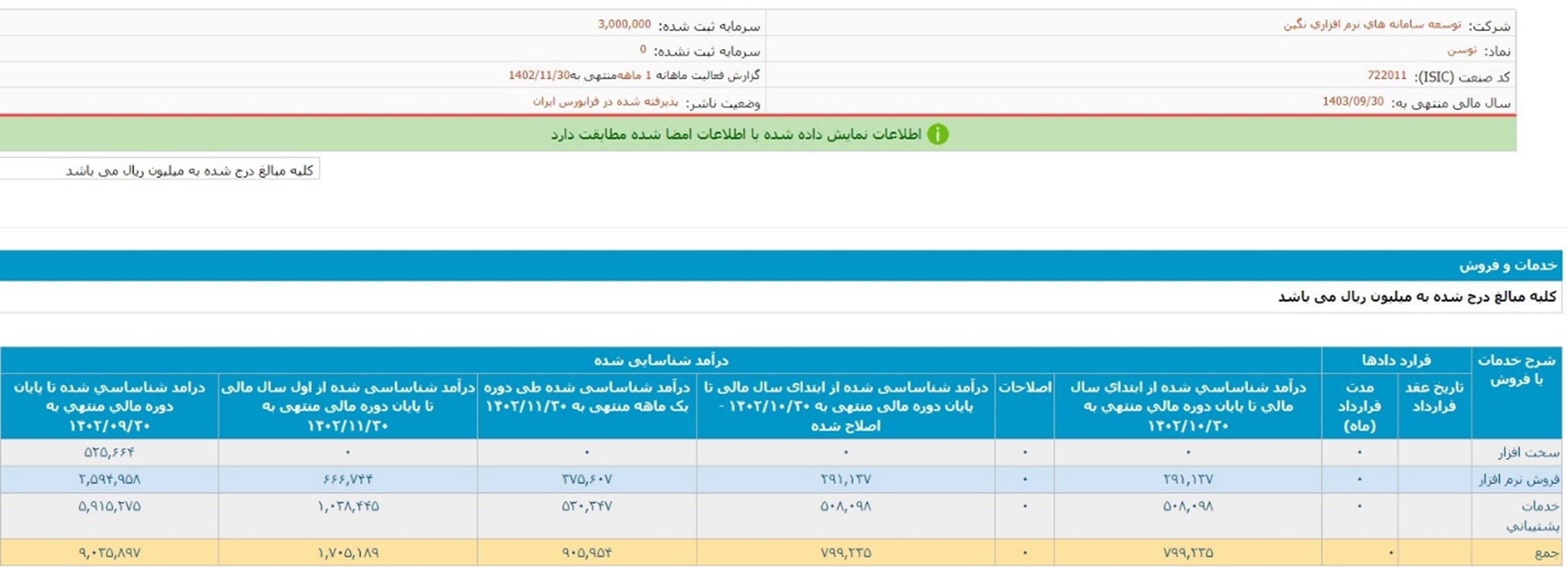 به گزارش تابناک به نقل از نبض فناوری، شرکت توسعه سامانه‌های نرم افزاری نگین با نماد «توسن» در بورس، از مجموع درآمد شناسایی شده در دوره یک ماهه منتهی به ۳۰ بهمن ۱۴۰۲ درآمدی معادل ۹۱ میلیارد تومان را در گزارش کدال اعلام می‌کند که با توجه به درآمد ۸۰ میلیارد تومانی آن در دی ماه نشان از رشد درآمد ۱۳ درصدی در بهمن ماه سالجاری دارد.